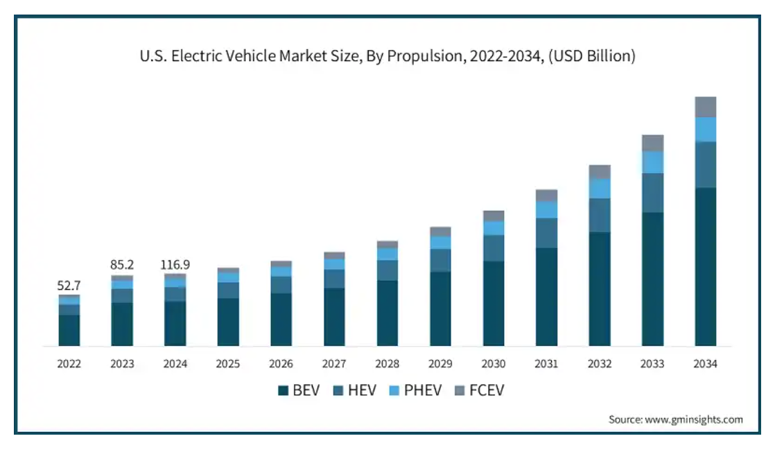 "아래의 그림처럼 미국의 전기차 시장은 계속해서 증가할 것이라고 전망된다. 전기차가 일반 차량에 비해서 가지는 장점도 많은 반면 단점도 많다고 생각한다. 종종 전기차와 관련된 사고가 일어났다는 뉴스를 보았다. 전기차를 하면 가장 먼저 떠오르는 테슬라는 모든 자동차 브랜드 중 가장 높은 사망 사고율을 보인다는 연구 결과가 나왔다. 최근 미국 자동차 시장조사업체 iSeeCars가 미국 치명적 사고 분석 시스템(FARS)의 데이터를 분석한 결과, 테슬라 차량은 미국 내 모든 자동차 브랜드 중에서 가장 높은 치명적 사고율을 기록했다. 연구 결과 테슬라 차량의 치명적 충돌 사고율은 주행거리 10억마일(약 16억킬로미터)당 5.6건이고, 기아는 5.5건으로 2위, 뷰익은 4.8건으로 3위를 차지했다. 미국 내 모든 차량의 평균 치명적 충돌 사고율은 주행 거리 10억마일당 2.8건이다. 그럼에도 전기차의 구매량이 늘어나고 있는 것 같은데 왜 전기차를 사려는 건지 그 이유에 대해 조사해보았다. 먼저 전기차는 작동 중에도 조용하고, 정숙한 주행 환경을 제공한다. 또 변속 충격이 없어 저속에서도 탁월한 가속 성능을 보여준다. 마지막으로 유지비 측면에서도 비용 절감 효과를 누릴 수 있다."