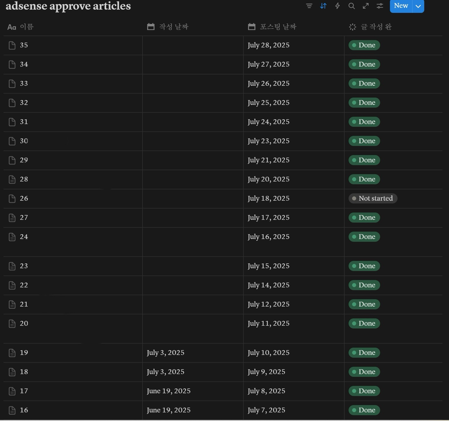 밑은 제가 포스팅을 하루도 빠짐없이 하려고 정리해둔 표입니다. 노션을 활용했는데, 노션이 비록 유료앱이지만 정말 일을 효율적으로 하는데 효과적입니다.  솔직히 매일매일 하는 게 정말 어렵지만 고진감래라는 말이 있듯이 그걸 믿고 계속 나아간 것 같습니다.